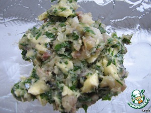 2. Измельченное филе малосольной сельди смешаем с зеленью и половиной сливочного масла (масло нужно заранее вынуть из холодильника, чтобы оно было мягким).