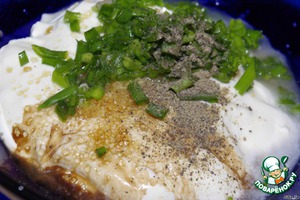 Для соуса в сметану добавляем лимонный сок, оставшийся сахар, бальзамический уксус и мелко нарезанный зелёный лук. Всё хорошо перемешиваем, если необходимо, по вкусу добавляем соль.