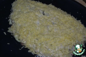 Верх хорошо смазываем оставшимся соусом и посыпаем со всех сторон натёртым на мелкой тёрке сыром (немного сыра оставляем).