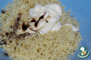 Промежутки оформляем натёртым сыром, подкрашенным бальзамическим уксусом.