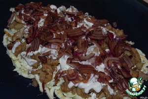 Первым слоем выкладываем яичную соломку - в форме лапы тигра.