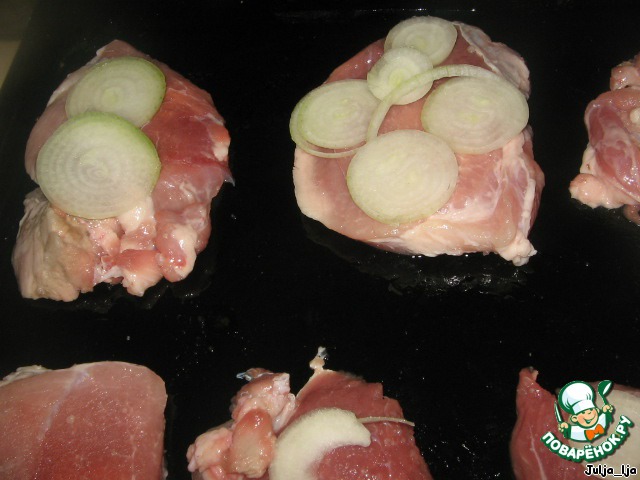 • Свинину нарезать плоскими ломтиками толщиной около 1 см, посолить и поперчить - по вкусу.