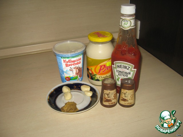 • Приготовим соус из сметаны, майонеза, чеснока, кетчупа и горчицы, добавить соль, перец по вкусу. Перемешать и дать настояться.