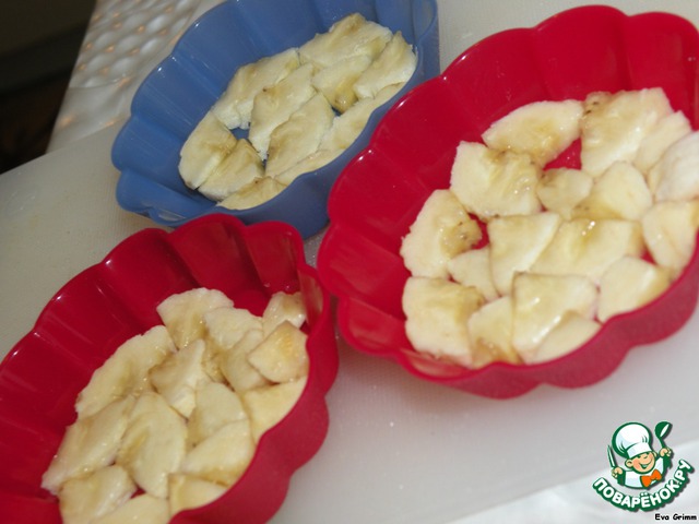 Банан нарезать и уложить в формочки, банана нарежьте столько, сколько душе Вашей угодно. Масло наливаем в стакан и ставим в морозилку.