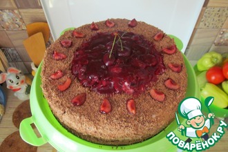 Теперь коржи у нас уже выпеклись разрезаны на три части и остыли, теперь берeм тарелку, кладeм один корж пропитывает его оставшимся сиропом (надо сироп разделить на три коржа, можно разбавить его водой), кладeм ягоды, далее начинку(сливки сироп и т. д), затем еще корж пропитываем и также как и первый, повторяем все с третьим коржом.