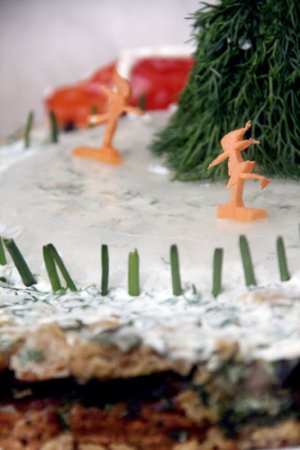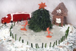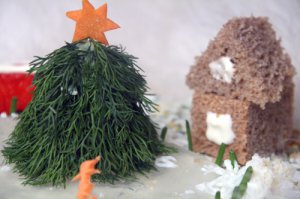 На елку помещаем звезду из морковки. Из черного хлеба вырезаем домик, майонезом рисуем окошки.