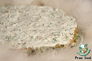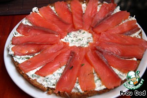 Собираем торт. Нижний корж промазываем половиной творожной смеси, сверху укладываем тонко нарезанную семгу.
