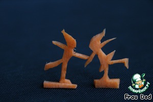 Самое сложное - вырезать человечков из моркови. Как и у Фроси Педалькиной, меня за этим застал муж. Но он к таким зрелищам привычный.. Шляпки к желудям приклеивала, макароны, шишки, веточки красила, тыкву вырезала.. Теперь пришел черед морковки.