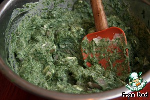 Шпинат и грибы обжарить на сковороде. Если используете свежие продукты - обжаривать не более 5 минут, посолить. Если замороженные, то пока не выпарится жидкость и после этого - 5 минут. Дать оставшемуся соку стечь на дуршлаге.