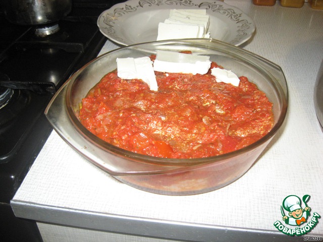 В посуду для духовки (или на противень) положить креветки, сверху вылить соус (если любите пожиже, то можно разбавить его бульоном) и нарезанную фету.