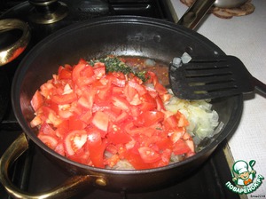 Затем добавить нарезанные помидоры, орегано и петрушку и тушить все 20-25 минут -