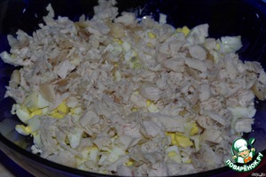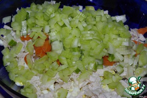 Отвариваем яйца, курицу (остужаем в бульоне, при варке солим и перчим - по вкусу), морковь.