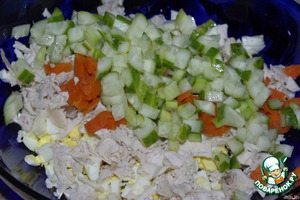 Огурец - кубиками. Кожицу я не очищала, она сейчас довольно нежная.