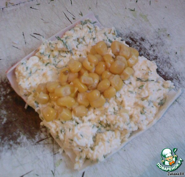 Аккуратно разворачиваем крабовые палочки, намазываем нашу начинку, сверху кладём кукурузу, заворачиваем.
