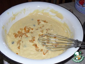 Сухую смесь смешать с жидкой до однородной массы, добавить изюм и варенье из апельсиновых корочек.