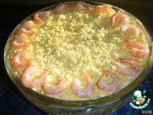 Украшаем сверху креветками и розочкой из нарезки красной рыбки.