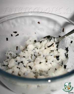 В остывший (до комнатной температуры) рис высыпаем кусочки нори и аккуратненько поливаем уксусом. Теперь не мешаем, иначе рис превратится в кашу, а просто рисуем снежинку, таким образом распределяя нори и уксус. -