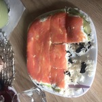 Красную рыбку нарезаем тоненькими (как на продажу) кусочками. Очень тоненькими. Мой любимый размер на бутерброд - 1.5 см толщиной, а тут...улет!