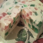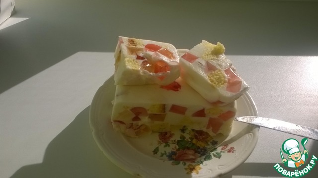 • Застывшее желе вынуть из холодильника и порезать на кубики или ромбики. Аккуратно смешать желе с основной массой.