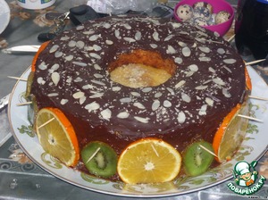 Третий корж облить растопленным шоколадом и обсыпать миндалем.