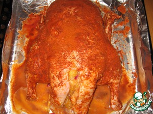 Утку натереть паприкой и нафаршировать гущей из соуса (жидкость оставить). Поставить в разогретую до 180 С духовку на 80 мин.(Моя утка - 2,1 кг), потом проверить ее готовность, проткнуть, сок должен быть прозрачным. Если нет - поставить обратно в духовку.