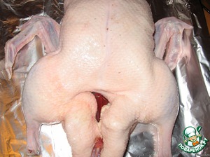 Утку помыть, убрать лишний жир, натереть солью. Положить на противень.