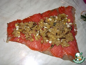Поперчить и добавить мускат. Начинку выложить на рыбу. -