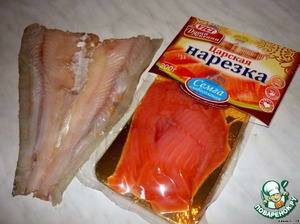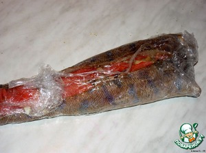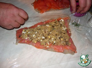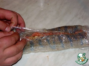 Филе кладем на пищевую пленку и аккуратно совмещаем стороны рыбы.