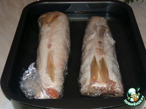 Духовку включаем на 150 градусов, в противень наливаем воды и выкладываем рыбу. Запекаем 1 час.