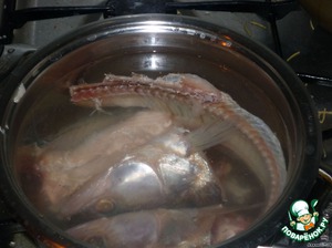 Кости, голову кладем в кастрюлю, заливаем холодной водой и отвариваем до готовности - 15 минут кипения.