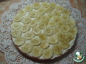 Так же промазываем, прокладываем бананами и засыпаем орехами следующие коржи, кроме верхнего коржа.