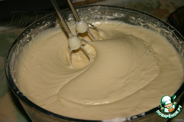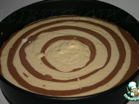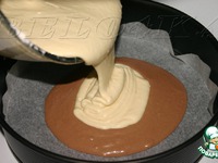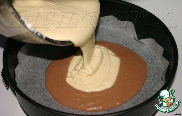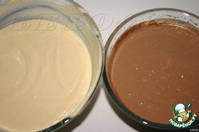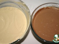 Получившееся тесто делим на 2 части. В одну добавляем какао, другую оставляем как есть. Ту, которая с какао, перемешиваем (взбиваем) миксером. |
