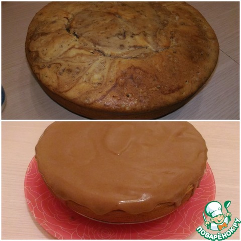 Час прошел, достаем из духовки...треснул и в серединке чуть выше, чем с краев. Ну, ничего страшного. Серединку подрезаем, сравнивая по высоте с краями, а трещину маскируем глазурью. |