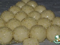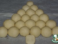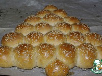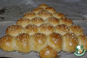 Противень застилаем пергаментной бумагой, выкладываем булочки в форме ёлочки. Первый ряд 6 шариков, второй - 5 и т.д. У основания кладём сплюснутый шарик, это будет ножка. |