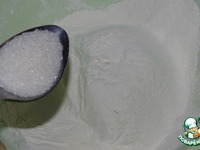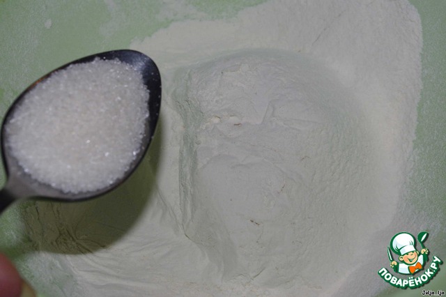 Муку просеиваем в миску. Добавляем сахар и соль, распределяя их по краям. |