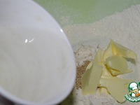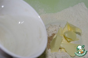 В центр кладём дрожжи и сливочное масло, нарезанное кусочками. |
