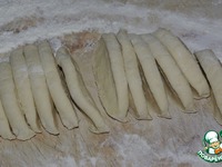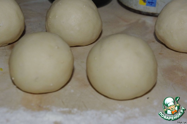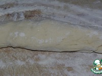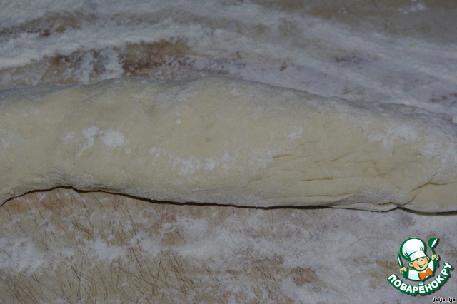 Далее тесто собираем в шар и кидаем с силой об стол. Делать это нужно 8-10 минут, как написано в рецепте. Я время не засекала, но ударов 15 было. Далее оставляем тесто в тёплом месте на 15 минут. Потом разминаем и скатываем в толстый жгут. |