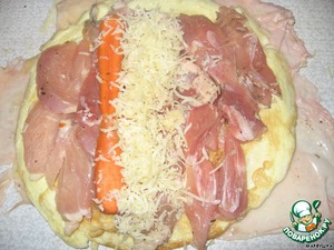 Выкладываем кожу, на нее куски мяса, морковь и тертый сыр.