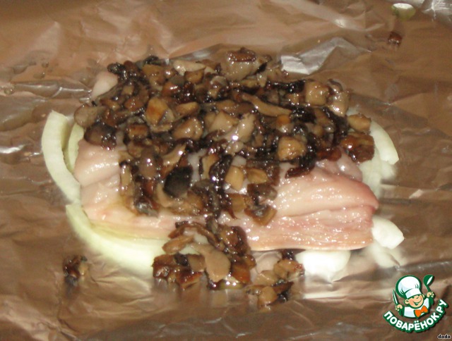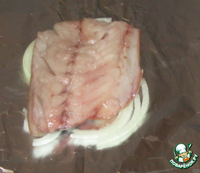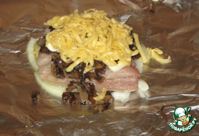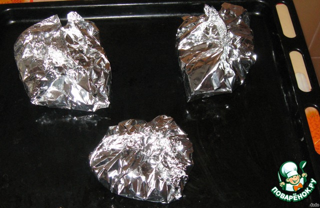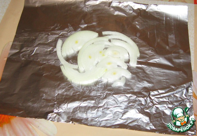 • Фольгу завернуть, положить на противень и запекать в духовке, разогретой до 180*С, в течение 30-35 мин.(я запекала при 200*С, и лук немного подгорел).
