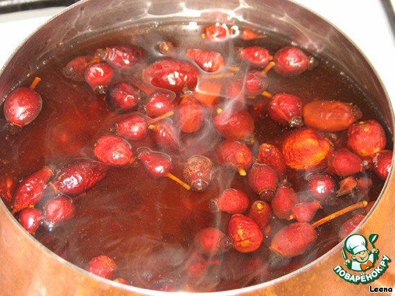 Плоды шиповника залить холодной водой. Примерно один стакан на 2 литра воды. Довести до кипения и варить 10 минут на маленьком огне. Я делаю это вечером. Ночь напиток настаивается, а с утра он получается с густым цветом и вкусом.