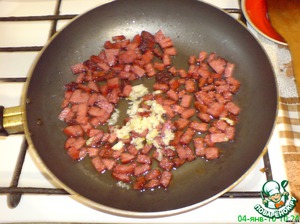 Когда колбаса поджарится до золотистого цвета, добавить чеснок. Чеснок, предварительно, выдавить или мелко нарезать.