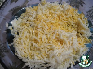 Натереть на крупной терке маргеланскую редьку, сверху немного майонеза. Натереть на мелкой терке сыр и посыпать толчеными орешками. Получается салат из нескольких слоев. Дать пропитаться.