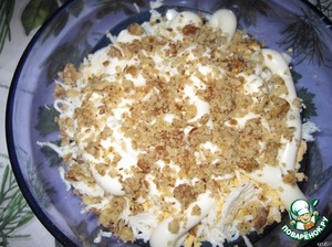 Небольшой слой майонеза. Грецкие орехи растолочь в ступке и посыпать сверху салат.