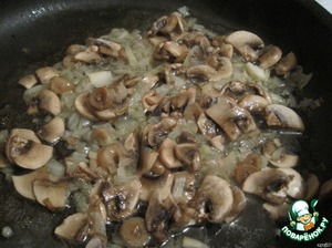 Нарезать мелко лук, обжарить на масле. Добавить нарезанные грибы, обжарить, остудить.