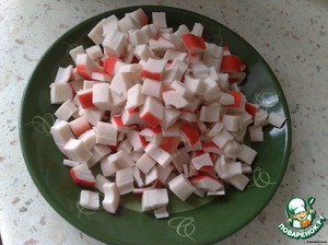 Крабовые палочки нарезаем кубиками.