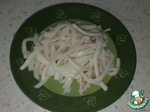 Кальмары вынимаем из отвара, охлаждаем и режем соломкой. -