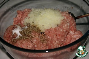 В фарш добавляем лук (или сразу в мясорубку, или, если фарш делали заранее и заморозили, то измельченный или просто порезанный, я натерла на мелкой терке) и специи. Солим по вкусу. Тщательно вымешиваем. -
