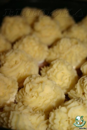Картофельное пюре заталкиваем в кондитерский шприц и выдавливаем поверх наших котлеток. В зависимости от насадки, которую возьмете, будет отличаться вид пирожных. У меня вырез звездочкой.