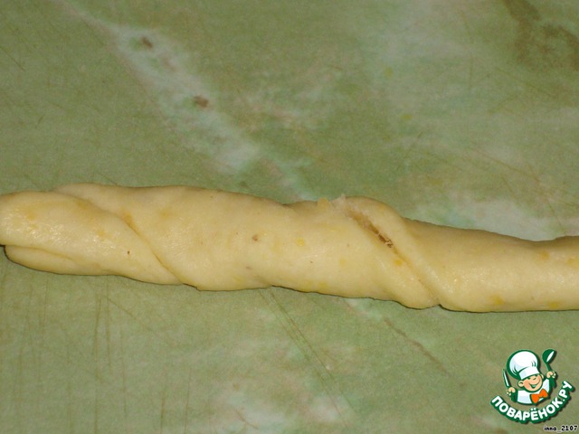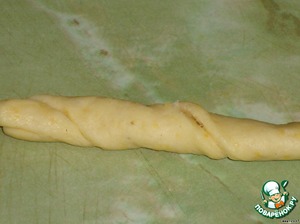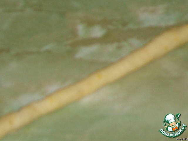 Раскатать до толщины, примерно, 3-5 мм и нарезать на полоски 10 см х 2 см. -