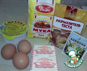 Берем все необходимые для теста составляющие (сметану уже открыла :), забыла, что буду фотографировать)